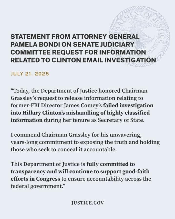 ¡°¿À´Ã, ¹ý¹«ºÎ´Â ±×¶ó½½¸® »ó¿øÀ§¿øÀåÀÇ ¿äû¿¡ µû¶ó, Àü FBI ±¹Àå Á¦ÀÓ½º ÄÚ¹ÌÀÇ Èú·¯¸® Ŭ¸°ÅÏÀÇ °íµµ·Î ±â¹ÐµÈ Á¤º¸¿¡ ´ëÇÑ ºÎÀûÀýÇÑ Ã³¸®¿¡ °üÇÑ ½ÇÆÐÇÑ ¼ö»ç¿¡ ´ëÇÑ Á¤º¸¸¦ °ø°³Çϱâ·Î Çß½À´Ï´Ù.